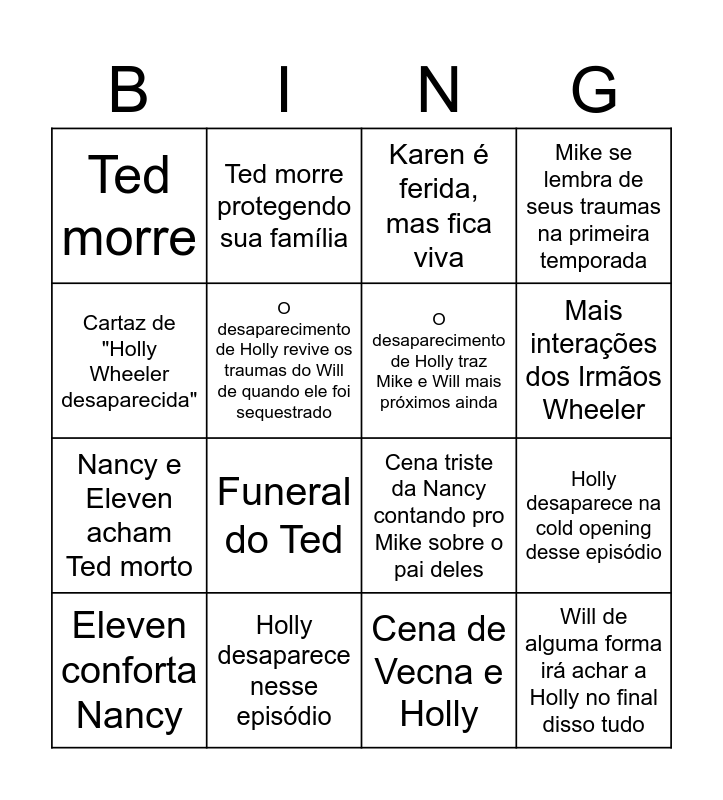 This bingo card has 16 words: Holly desaparece nesse episódio, Holly desaparece na cold opening desse episódio, Karen é ferida, mas fica viva, Ted morre, Nancy e Eleven acham Ted morto, Ted morre protegendo sua família, Cena triste da Nancy contando pro Mike sobre o pai deles, Cena de Vecna e Holly, Cartaz de "Holly Wheeler desaparecida", O desaparecimento de Holly revive os traumas do Will de quando ele foi sequestrado, Eleven conforta Nancy, Mike se lembra de seus traumas na primeira temporada, Funeral do Ted, Mais interações dos Irmãos Wheeler, O desaparecimento de Holly traz Mike e Will mais próximos ainda and Will de alguma forma irá achar a Holly no final disso tudo.