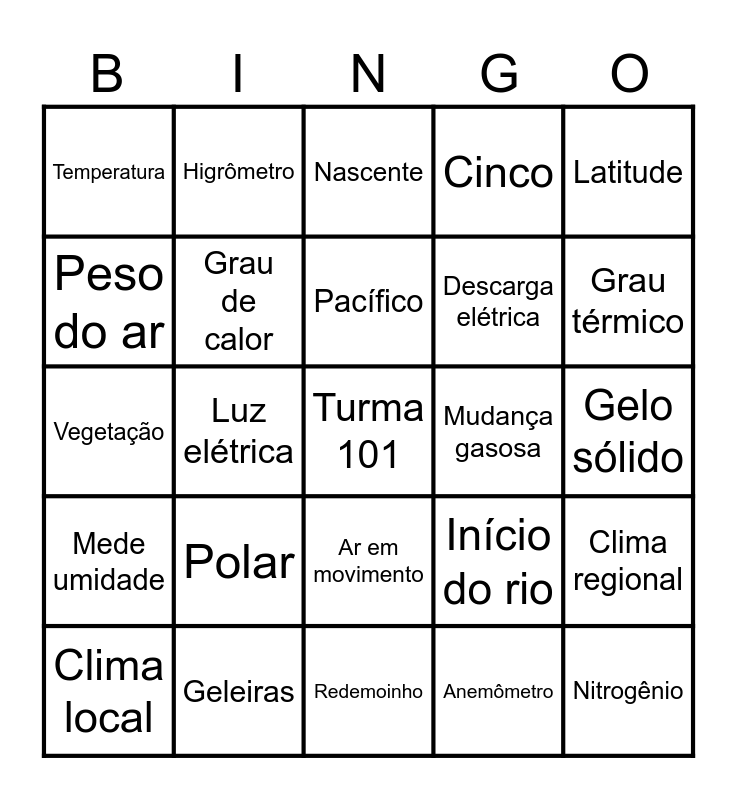 This bingo card has a free space and 24 words: Polar, Geleiras, Pacífico, Clima local, Latitude, Temperatura, Peso do ar, Higrômetro, Mudança gasosa, Ar em movimento, Descarga elétrica, Vegetação, Início do rio, Clima regional, Grau de calor, Anemômetro, Gelo sólido, Nascente, Grau térmico, Luz elétrica, Nitrogênio, Mede umidade, Cinco and Redemoinho.