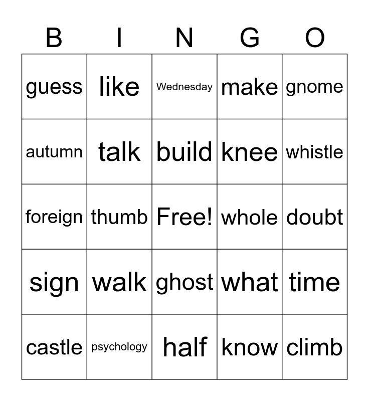 This bingo card has a free space and 29 words: castle, would, thumb, hour, guess, Wednesday, talk, walk, whole, psychology, doubt, climb, half, know, whistle, who, ghost, sign, gnome, foreign, what, knife, knee, autumn, make, like, time, build and listen.
