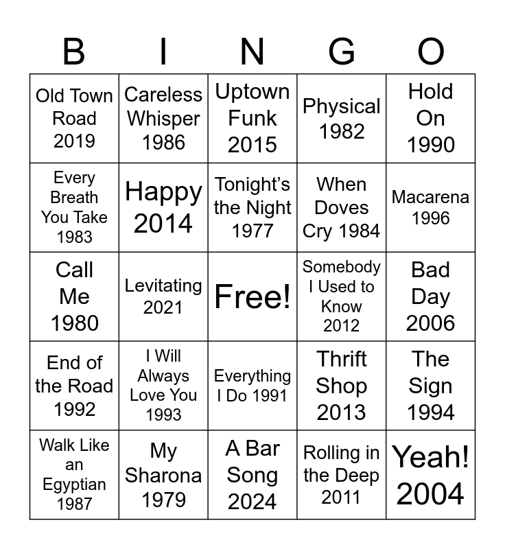 This bingo card has a free space and 31 words: A Bar Song 2024, Last Night 2023, Levitating 2021, Blinding Lights 2020, Old Town Road 2019, Uptown Funk 2015, Happy 2014, Thrift Shop 2013, Somebody I Used to Know 2012, Rolling in the Deep 2011, Bad Day 2006, Yeah! 2004, In Da Club 2003, Believe 2000, Macarena 1996, Gangsta’s Paradise 1995, The Sign 1994, I Will Always Love You 1993, End of the Road 1992, Everything I Do 1991, Hold On 1990, Faith 1988, Walk Like an Egyptian 1987, Careless Whisper 1986, When Doves Cry 1984, Every Breath You Take 1983, Physical 1982, Call Me 1980, My Sharona 1979, Tonight’s the Night 1977 and Love Will Keep Us Together 1975..