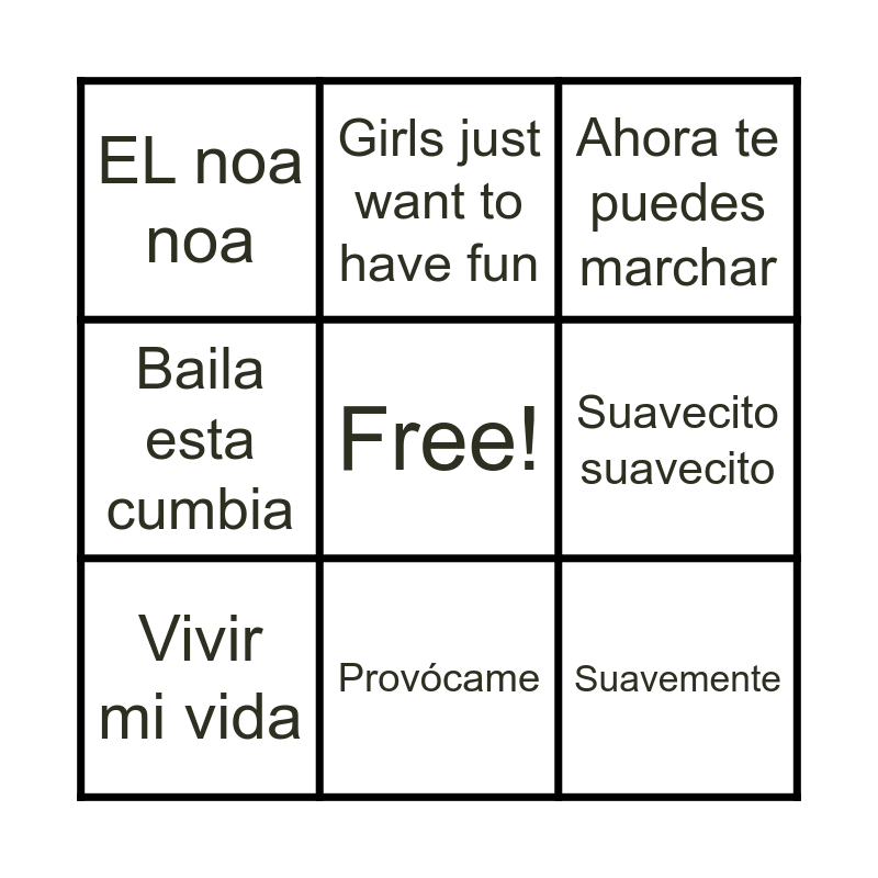 This bingo card has a free space and 33 words: Yo quien bailar, Torero, Olvídame y pega la vuelta, Mi gran noche, La bomba, Vivir mi vida, Suavemente, Mambo No5, Girls just want to have fun, El viejo del Sombreron, Provócame, Ahora te puedes marchar, Azúcar amargo, Flowers, La negra Catalina, Juana la cubana, Botella envenenada, Adiós amor, Regalo de Dios, Lo tienes todo, Tu cárcel, Morenita, EL noa noa, Caray, Basurita, La Chona, Baila esta cumbia, Ramito de violetas, Suavecito suavecito, Sergio el bailador, El amor de su vida, No se va and La vecinita.