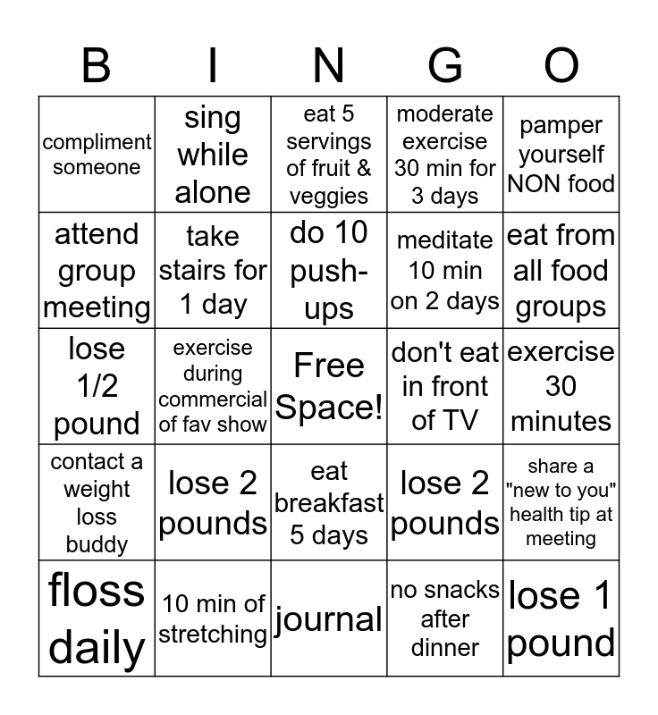 This bingo card has a free space and 24 words: lose 2 pounds, 10 min of stretching, do 10 push-ups, floss daily, pamper yourself NON food, compliment someone, attend group meeting, sing while alone, don't eat in front of TV, eat breakfast 5 days, meditate 10 min on 2 days, lose 1/2 pound, lose 2 pounds, share a "new to you" health tip at meeting, take stairs for 1 day, no snacks after dinner, exercise 30 minutes, eat 5 servings of fruit & veggies, eat from all food groups, exercise during commercial of fav show, lose 1 pound, contact a weight loss buddy, moderate exercise 30 min for 3 days and journal.