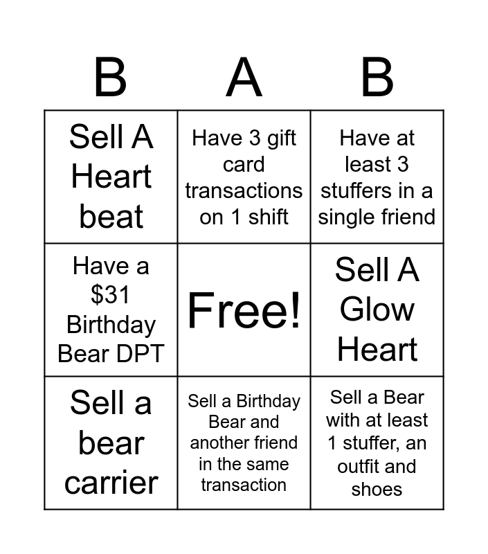 This bingo card has a free space and 8 words: Sell A Glow Heart, Have at least 3 stuffers in a single friend, Have 3 gift card transactions on 1 shift, Sell a bear carrier, Sell A Heart beat, Sell a Bear with at least 1 stuffer, an outfit and shoes, Have a $31 Birthday Bear DPT and Sell a Birthday Bear and another friend in the same transaction.