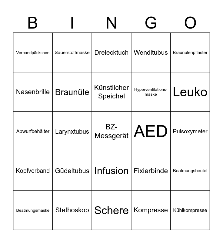 This bingo card has 30 words: Stethoskop, Blutdruck- manschette, Larynxtubus, Thomasholder, Verbandpäckchen, Dreiecktuch, Braunüle, Infusion, AED, Schere, Pulsoxymeter, BZ-Messgerät, Kompresse, Kühlkompresse, Leuko, Magill- Zange, Fixierbinde, Kopfverband, Güdeltubus, Braunülenpflaster, Abwurfbehälter, Sauerstoffflasche, Sauerstoffmaske, Hyperventilations-maske, Nasenbrille, Wendltubus, Beatmungsbeutel, Beatmungsmaske, Künstlicher Speichel and Glucosegel.