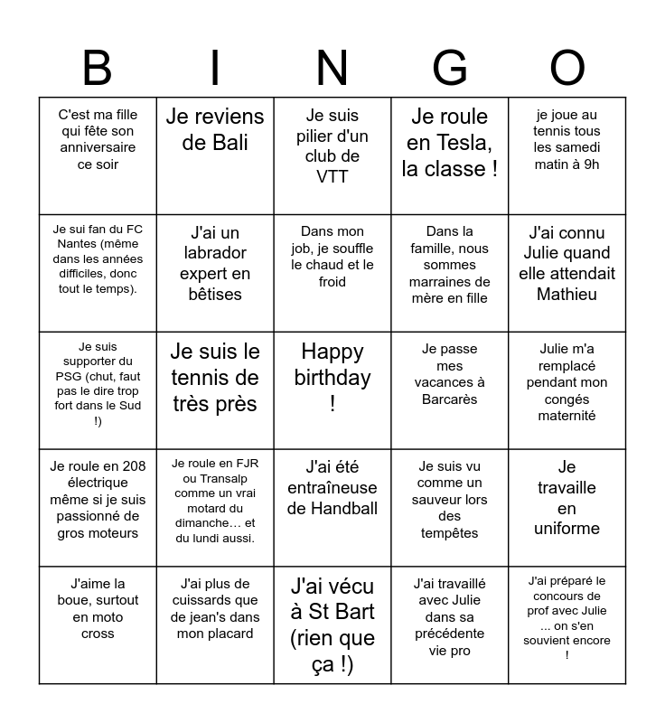 This bingo card has a free space and 24 words: Je roule en FJR ou Transalp comme un vrai motard du dimanche… et du lundi aussi., J'ai plus de cuissards que de jean's dans mon placard, Dans mon job, je souffle le chaud et le froid, J'aime la boue, surtout en moto cross, je joue au tennis tous les samedi matin à 9h, C'est ma fille qui fête son anniversaire ce soir, Je sui fan du FC Nantes (même dans les années difficiles, donc tout le temps)., Je reviens de Bali, Je passe mes vacances à Barcarès, J'ai été entraîneuse de Handball, Dans la famille, nous sommes marraines de mère en fille, Je suis supporter du PSG (chut, faut pas le dire trop fort dans le Sud !), Je suis vu comme un sauveur lors des tempêtes, Je travaille en uniforme, J'ai un labrador expert en bêtises, J'ai travaillé avec Julie dans sa précédente vie pro, Julie m'a remplacé pendant mon congés maternité, Je suis pilier d'un club de VTT, J'ai connu Julie quand elle attendait Mathieu, Je suis le tennis de très près, J'ai préparé le concours de prof avec Julie ... on s'en souvient encore !, Je roule en 208 électrique même si je suis passionné de gros moteurs, Je roule en Tesla, la classe ! and J'ai vécu à St Bart (rien que ça !).