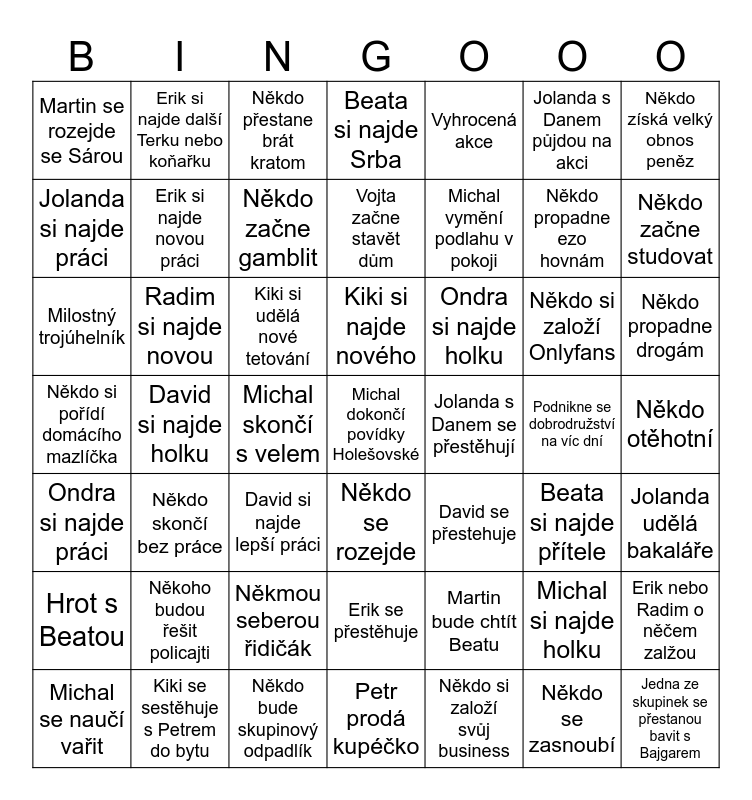 This bingo card has 49 words: Michal si najde holku, Někdo propadne ezo hovnám, Někdo si založí svůj business, David si najde holku, Kiki si udělá nové tetování, Někdo otěhotní, Erik si najde další Terku nebo koňařku, Někdo bude skupinový odpadlík, Jolanda s Danem půjdou na akci, Někdo se rozejde, Někdo získá velký obnos peněz, Beata si najde Srba, Někdo si založí Onlyfans, Ondra si najde holku, Někoho budou řešit policajti, Podnikne se dobrodružství na víc dní, Jolanda si najde práci, Někdo začne studovat, Erik nebo Radim o něčem zalžou, Vyhrocená akce, Michal vymění podlahu v pokoji, Michal skončí s velem, Martin se rozejde se Sárou, Erik si najde novou práci, Michal se naučí vařit, Někdo začne gamblit, Někdo propadne drogám, Kiki se sestěhuje s Petrem do bytu, Kiki si najde nového, Radim si najde novou, Jedna ze skupinek se přestanou bavit s Bajgarem, Jolanda s Danem se přestěhují, Hrot s Beatou, Někmou seberou řidičák, Někdo si pořídí domácího mazlíčka, David se přestehuje, Beata si najde přítele, Jolanda udělá bakaláře, Milostný trojúhelník, David si najde lepší práci, Erik se přestěhuje, Ondra si najde práci, Michal dokončí povídky Holešovské, Petr prodá kupéčko, Vojta začne stavět dům, Někdo přestane brát kratom, Martin bude chtít Beatu, Někdo skončí bez práce and Někdo se zasnoubí.