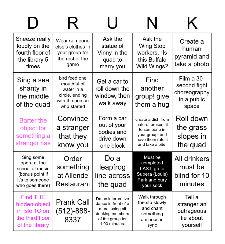 This bingo card has 25 words: Order something at Allende Restaurant, Do an interpretive dance in front of a mural using all drinking members of the group for 1:00 minutes., Get a car to roll down the window, then walk away, Find THE hidden object in Isle 1C on the third floor of the library, Create a human pyramid and take a photo, Sneeze really loudly on the fourth floor of the library 5 times, Sing a sea shanty in the middle of the quad, Wear someone else's clothes in your group for the rest of the game, create a dish from nature, present it to someone in your group, and have them rate it and take a bite., Do a leapfrog line across the quad, Find another group! give them a hug, Barter the object for something a stranger has, Must be completed LAST, go to Supera (Louis) Park and bury your sock, All drinkers must be blind for 10 minutes, bird feed one mouthful of water in a circle, ending with the person who started, Tell a stranger an outrageous lie about yourself, Roll down the grass slopes in the quad, Ask the statue of Vinny in the quad to marry you, Film a 30-second fight choreography in a public space, Convince a stranger that they know you, Form a car out of your bodies and drive down one block, Prank Call (512)-888-8337, Sing some opera at the school of music (bonus point if it’s to someone who goes there), Ask the Wing Stop workers, “Is this Buffalo Wild Wings? and Walk through the stu slowly and chant something ominous in sync.