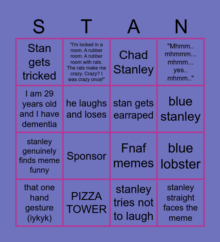 This bingo card has 16 words: that one hand gesture (iykyk), PIZZA TOWER, Chad Stanley, "Mhmm.. mhmmm... mhmm... yes.. mhmm..", I am 29 years old and I have dementia, "I'm locked in a room. A rubber room. A rubber room with rats. The rats make me crazy. Crazy? I was crazy once!", Fnaf memes, blue lobster, Stan gets tricked, he laughs and loses, stanley tries not to laugh, blue stanley, stanley genuinely finds meme funny, Sponsor, stan gets earraped and stanley straight faces the meme.