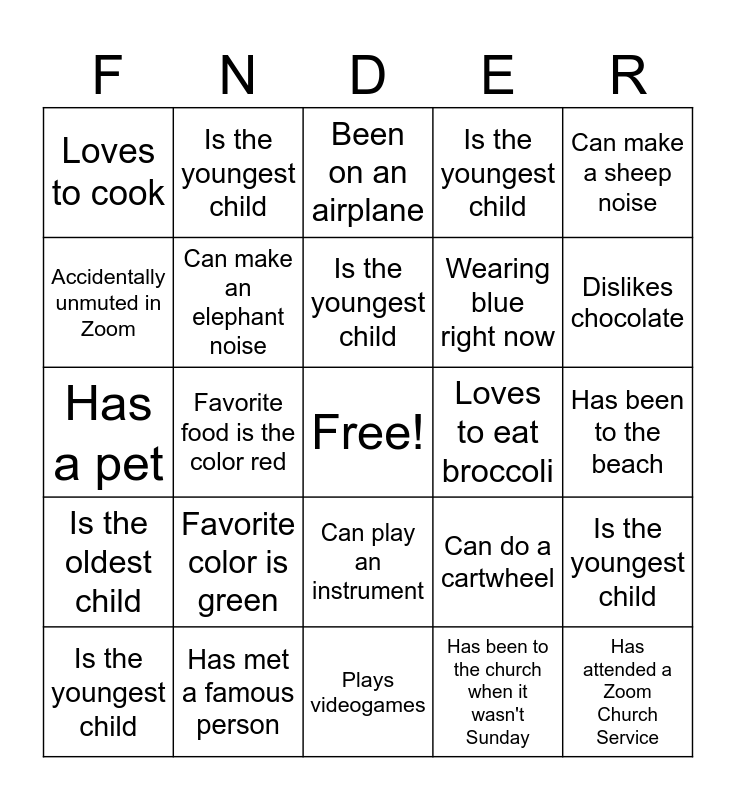 This bingo card has a free space and 29 words: Is the youngest child, Has gone camping, Favorite food is the color red, Knows how to ride a bike, Loves to cook, Been on an airplane, Can make an elephant noise, Favorite color is green, Loves to eat broccoli, Has met a famous person, Has been to the beach, Has attended a Zoom Church Service, Plays videogames, Has been to the church when it wasn't Sunday, Dislikes chocolate, Can name all the books of the bible in order, Can play an instrument, Is the oldest child, Can make a sheep noise, Has a pet, Can do a cartwheel, A prize winner/award winner, Wearing blue right now, Accidentally unmuted in Zoom, Is the youngest child, Is the youngest child, Is the youngest child, Is the youngest child and Is the youngest child.