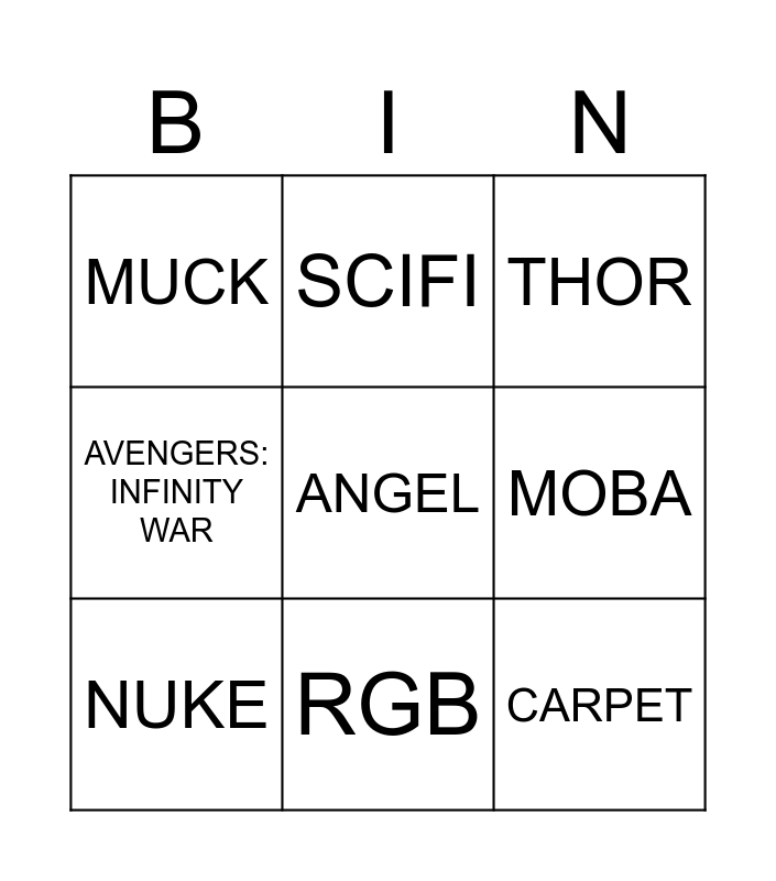 This bingo card has a free space and 8 words: MOBA, THOR, SCIFI, NUKE, MUCK, CARPET, AVENGERS: INFINITY WAR and RGB.