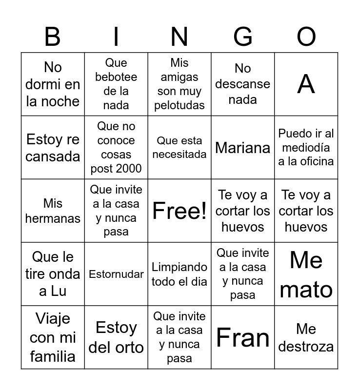 This bingo card has a free space and 28 words: Me mato, Grecia, Mariana, Fran, Estoy re cansada, Mis amigas son muy pelotudas, Que bebotee de la nada, Que le tire onda a Lu, Te voy a cortar los huevos, Viaje con mi familia, Mis hermanas, No descanse nada, Estoy del orto, Que invite a la casa y nunca pasa, Puedo ir al mediodía a la oficina, Patito, Estornudar, Que no conoce cosas post 2000, Que esta necesitada, Limpiando todo el dia, No dormi en la noche, Cociono algo y no la trae, Me destroza, Que invite a la casa y nunca pasa, Te voy a cortar los huevos, Que invite a la casa y nunca pasa, A and B.