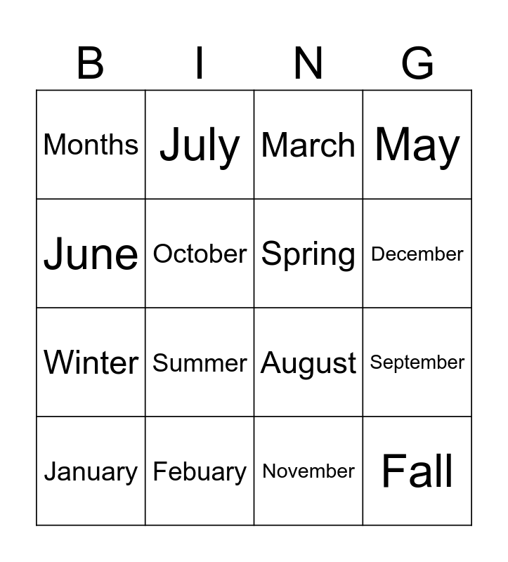 This bingo card has 16 words: January, Febuary, March, May, June, July, August, September, Months, October, November, December, Winter, Summer, Spring and Fall.