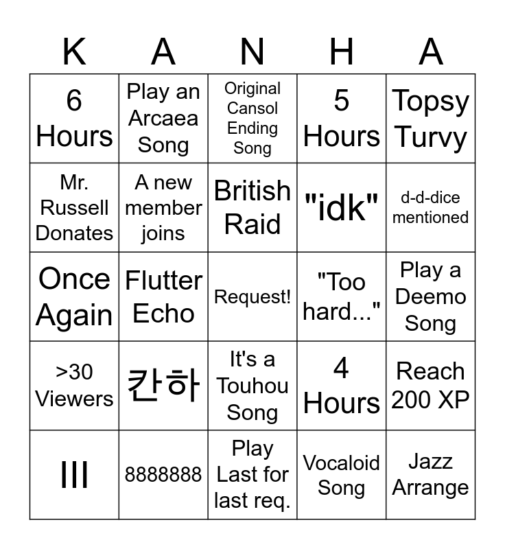 This bingo card has a free space and 24 words: 칸하, 8888888, British Raid, III, Topsy Turvy, 6 Hours, Mr. Russell Donates, Play an Arcaea Song, "Too hard...", It's a Touhou Song, "idk", Once Again, 4 Hours, Reach 200 XP, A new member joins, Vocaloid Song, Play a Deemo Song, Original Cansol Ending Song, d-d-dice mentioned, Flutter Echo, Jazz Arrange, >30 Viewers, 5 Hours and Play Last for last req..