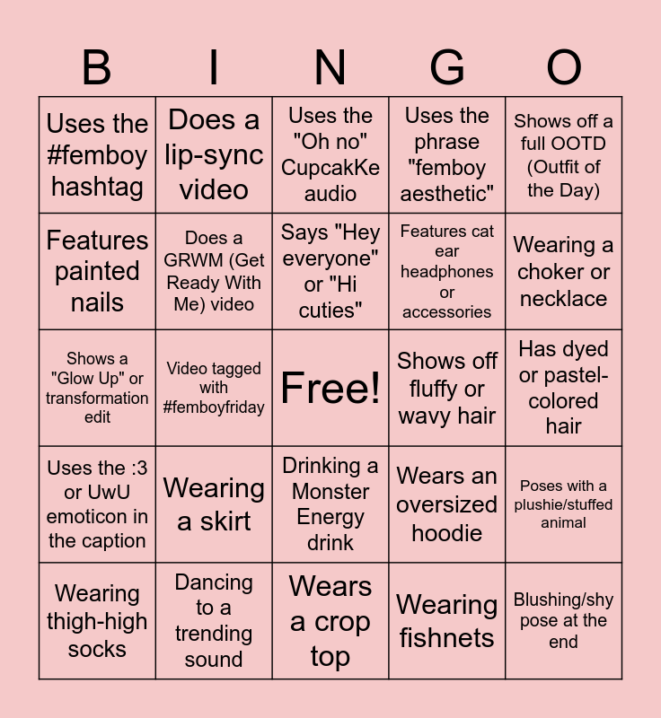 This bingo card has a free space and 24 words: Wearing a skirt, Dancing to a trending sound, Says "Hey everyone" or "Hi cuties", Wearing thigh-high socks, Shows off a full OOTD (Outfit of the Day), Uses the #femboy hashtag, Features painted nails, Does a lip-sync video, Shows off fluffy or wavy hair, Drinking a Monster Energy drink, Features cat ear headphones or accessories, Shows a "Glow Up" or transformation edit, Wears an oversized hoodie, Poses with a plushie/stuffed animal, Does a GRWM (Get Ready With Me) video, Wearing fishnets, Has dyed or pastel-colored hair, Uses the "Oh no" CupcakKe audio, Wearing a choker or necklace, Video tagged with #femboyfriday, Blushing/shy pose at the end, Uses the :3 or UwU emoticon in the caption, Uses the phrase "femboy aesthetic" and Wears a crop top.