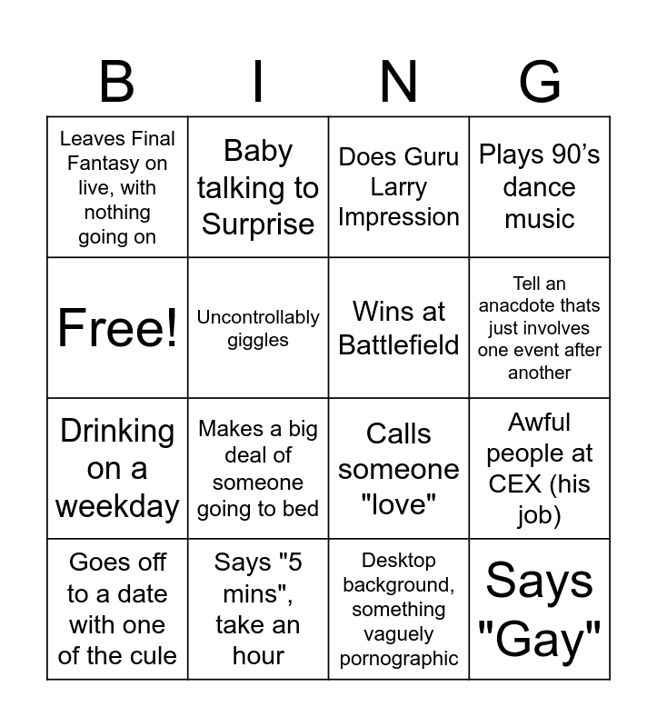 This bingo card has 16 words: Says "5 mins", take an hour, Awful people at CEX (his job), Does Guru Larry Impression, Leaves Final Fantasy on live, with nothing going on, Drinking on a weekday, Baby talking to Surprise, Calls someone "love", Desktop background, something vaguely pornographic, Free!, Uncontrollably giggles, Goes off to a date with one of the cule, Plays 90’s dance music, Makes a big deal of someone going to bed, Tell an anacdote thats just involves one event after another, Wins at Battlefield and Says "Gay".