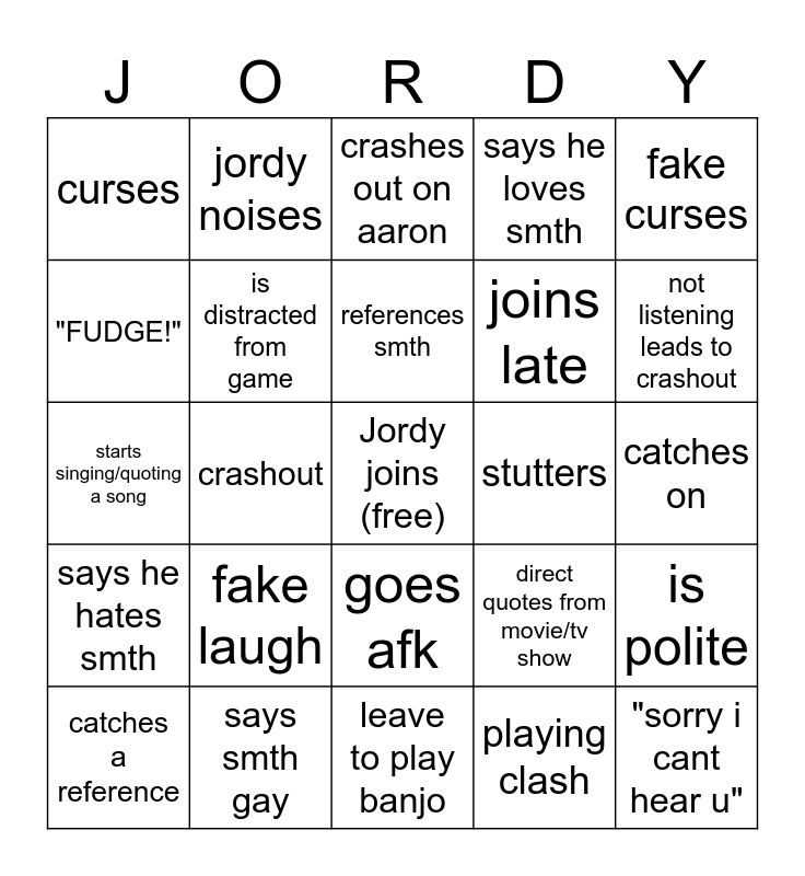 This bingo card has a free space and 24 words: fake laugh, says smth gay, references smth, catches a reference, fake curses, curses, "FUDGE!", jordy noises, stutters, goes afk, joins late, starts singing/quoting a song, direct quotes from movie/tv show, is polite, is distracted from game, playing clash, catches on, crashes out on aaron, not listening leads to crashout, crashout, "sorry i cant hear u", says he hates smth, says he loves smth and leave to play banjo.