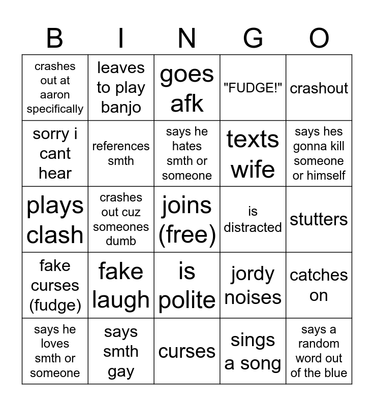 This bingo card has a free space and 24 words: fake laugh, says smth gay, says he hates smth or someone, says he loves smth or someone, crashout, crashes out at aaron specifically, sorry i cant hear, leaves to play banjo, is distracted, is polite, texts wife, plays clash, jordy noises, catches on, references smth, sings a song, stutters, goes afk, says hes gonna kill someone or himself, crashes out cuz someones dumb, says a random word out of the blue, fake curses (fudge), "FUDGE!" and curses.