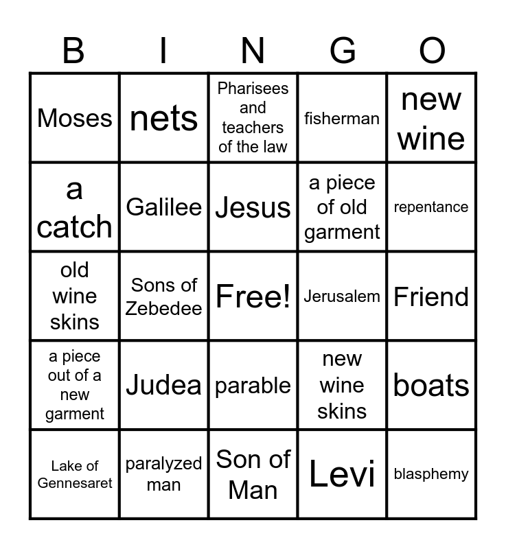 This bingo card has a free space and 29 words: Lake of Gennesaret, Simon Peter, Sons of Zebedee, leprosy, Moses, Pharisees and teachers of the law, Galilee, Judea, Jerusalem, paralyzed man, Friend, blasphemy, Son of Man, Levi, repentance, John's disciples, parable, a piece out of a new garment, new wine, old wine skins, new wine skins, old wine, a piece of old garment, a catch, fisherman, nets, boats, Jesus and Simon and the sons of Zebdee.