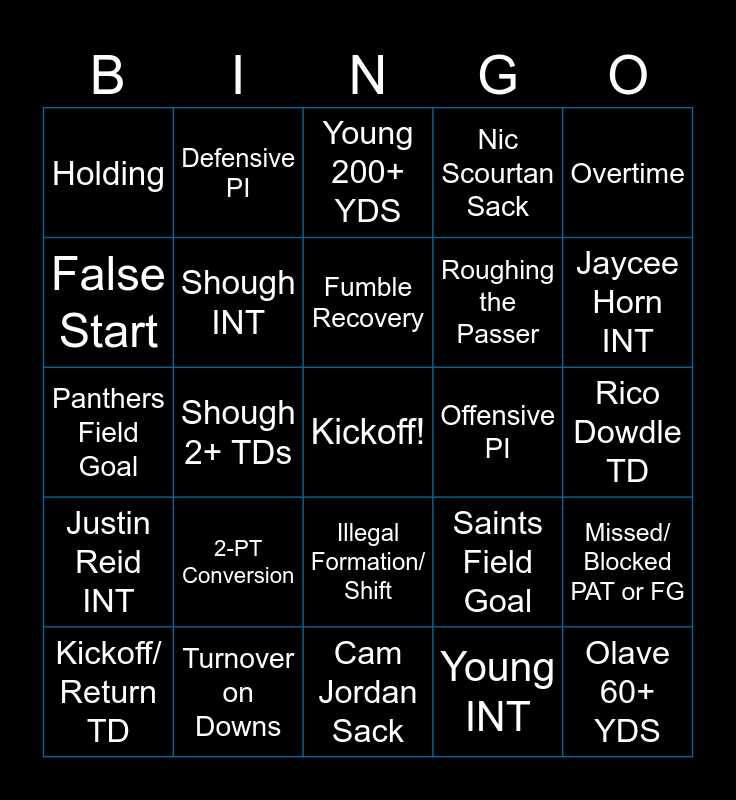 This bingo card has a free space and 24 words: 2-PT Conversion, Turnover on Downs, Fumble Recovery, Kickoff/ Return TD, Overtime, Holding, False Start, Defensive PI, Offensive PI, Illegal Formation/ Shift, Roughing the Passer, Panthers Field Goal, Saints Field Goal, Missed/ Blocked PAT or FG, Shough INT, Young INT, Rico Dowdle TD, Young 200+ YDS, Jaycee Horn INT, Shough 2+ TDs, Olave 60+ YDS, Justin Reid INT, Nic Scourtan Sack and Cam Jordan Sack.