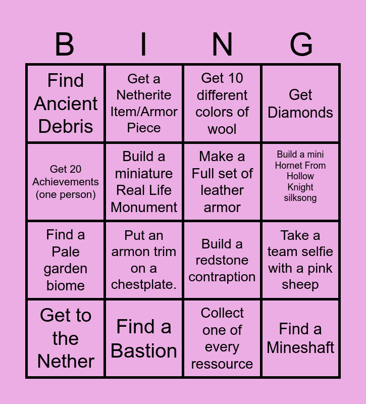 This bingo card has 16 words: Find a Bastion, Take a team selfie with a pink sheep, Get 10 different colors of wool, Find Ancient Debris, Find a Pale garden biome, Get a Netherite Item/Armor Piece, Build a redstone contraption, Collect one of every ressource, Get 20 Achievements (one person), Build a miniature Real Life Monument, Get to the Nether, Get Diamonds, Put an armon trim on a chestplate., Build a mini Hornet From Hollow Knight silksong, Make a Full set of leather armor and Find a Mineshaft.