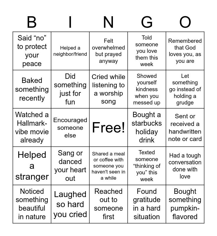This bingo card has a free space and 27 words: Texted someone “thinking of you” this week, Said “thank you” to God today, Showed yourself kindness when you messed up, Reached out to someone first, Baked something recently, Felt overwhelmed but prayed anyway, Helped a neighbor/friend, Helped a stranger, Bought a starbucks holiday drink, Had a tough conversation done with love, Watched a Hallmark-vibe movie already, Told someone you love them this week, Noticed something beautiful in nature, Laughed so hard you cried, Let something go instead of holding a grudge, Spent time being still or quiet, Did something just for fun, Cried while listening to a worship song, Sang or danced your heart out, Said “no” to protect your peace, Sent or received a handwritten note or card, Found gratitude in a hard situation, Encouraged someone else, Bought something pumpkin-flavored, Shared a meal or coffee with someone you haven't seen in a while, Remembered that God loves you, as you are and Gave yourself grace instead of guilt.