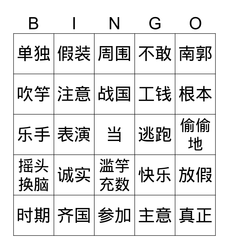 This bingo card has a free space and 24 words: 诚实, 齐国, 战国, 时期, 南郭, 单独, 吹竽, 假装, 逃跑, 滥竽 充数, 工钱, 乐手, 快乐, 放假, 注意, 主意, 偷偷地, 周围, 根本, 表演, 真正, 摇头 换脑, 不敢 and 参加.