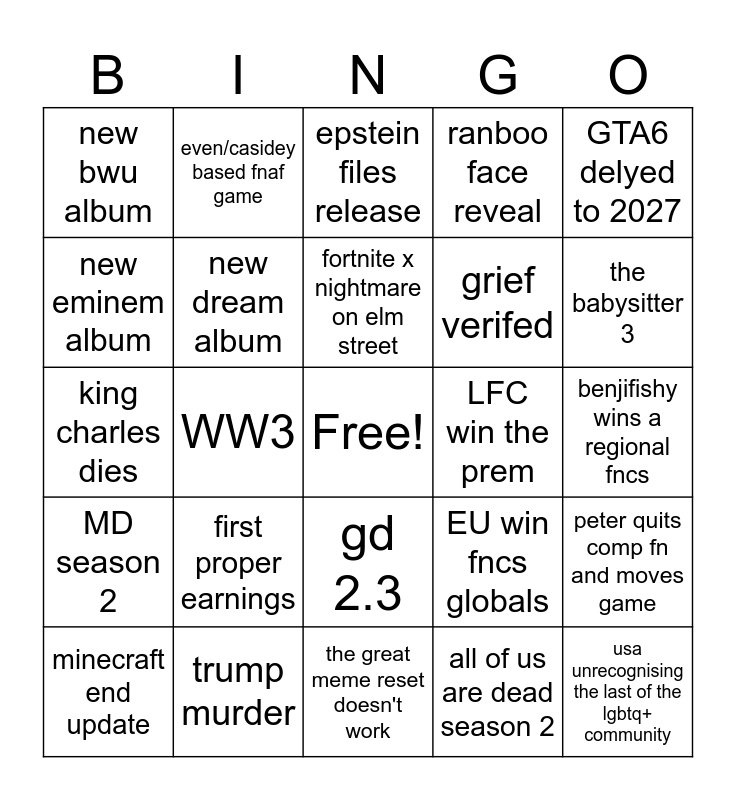 This bingo card has a free space and 24 words: first proper earnings, trump murder, fortnite x nightmare on elm street, minecraft end update, GTA6 delyed to 2027, new bwu album, new eminem album, even/casidey based fnaf game, LFC win the prem, gd 2.3, grief verifed, king charles dies, EU win fncs globals, peter quits comp fn and moves game, new dream album, all of us are dead season 2, benjifishy wins a regional fncs, epstein files release, the babysitter 3, WW3, usa unrecognising the last of the lgbtq+ community, MD season 2, ranboo face reveal and the great meme reset doesn't work.