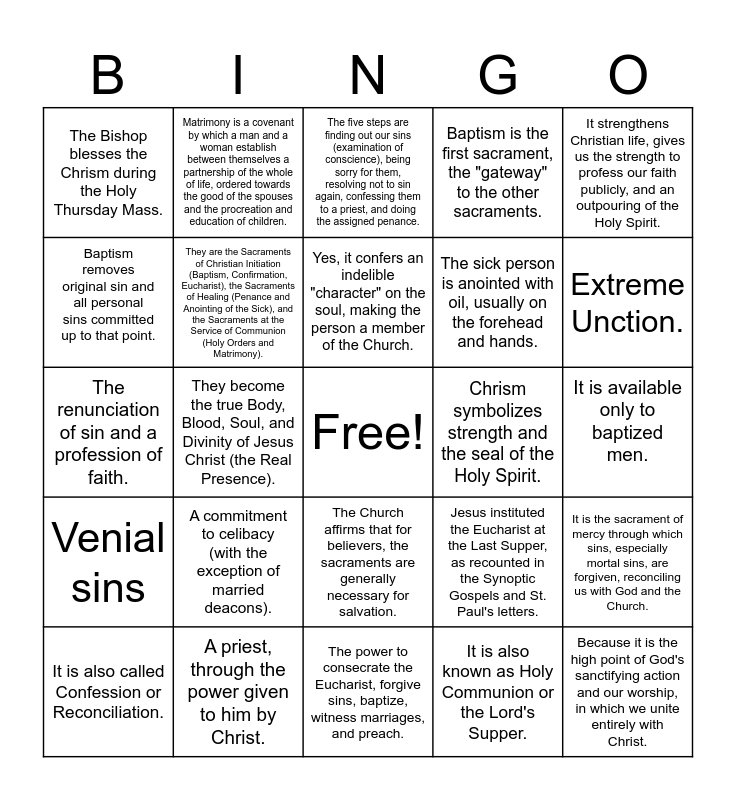This bingo card has a free space and 35 words: It's a special, visible sign that shows God's invisible grace (his help and love) in the world., Seven: Baptism, Confirmation, Eucharist, Reconciliation, Anointing of the Sick, Holy Orders, and Matrimony., Jesus Christ himself started all of them., They are the Sacraments of Christian Initiation (Baptism, Confirmation, Eucharist), the Sacraments of Healing (Penance and Anointing of the Sick), and the Sacraments at the Service of Communion (Holy Orders and Matrimony)., The Church affirms that for believers, the sacraments are generally necessary for salvation., Baptism is the first sacrament, the "gateway" to the other sacraments., Baptism removes original sin and all personal sins committed up to that point., Ordinary water poured on the forehead of the person being baptized., Yes, it confers an indelible "character" on the soul, making the person a member of the Church., A priest or deacon ordinarily administers Baptism, but in case of necessity, anyone can baptize using the proper form and intention., The renunciation of sin and a profession of faith., It strengthens Christian life, gives us the strength to profess our faith publicly, and an outpouring of the Holy Spirit., Holy Chrism is used, with anointing on the forehead in the form of a cross., The Bishop is the ordinary minister of Confirmation., The Bishop blesses the Chrism during the Holy Thursday Mass., Chrism symbolizes strength and the seal of the Holy Spirit., It is also known as Holy Communion or the Lord's Supper., They become the true Body, Blood, Soul, and Divinity of Jesus Christ (the Real Presence)., Venial sins, Because it is the high point of God's sanctifying action and our worship, in which we unite entirely with Christ., Jesus instituted the Eucharist at the Last Supper, as recounted in the Synoptic Gospels and St. Paul's letters., It is also called Confession or Reconciliation., It is the sacrament of mercy through which sins, especially mortal sins, are forgiven, reconciling us with God and the Church., A priest, through the power given to him by Christ., The five steps are finding out our sins (examination of conscience), being sorry for them, resolving not to sin again, confessing them to a priest, and doing the assigned penance., Extreme Unction., Any Catholic who is seriously ill, in danger of death, or experiencing the frailties of old age., It provides healing, strength, and consolation; it helps the recipient accept sickness and death willingly, and forgives sins if the sick person was unable to receive Penance., The sick person is anointed with oil, usually on the forehead and hands., It is available only to baptized men., Deacon, Priest, and Bishop., The power to consecrate the Eucharist, forgive sins, baptize, witness marriages, and preach., A commitment to celibacy (with the exception of married deacons)., Matrimony is a covenant by which a man and a woman establish between themselves a partnership of the whole of life, ordered towards the good of the spouses and the procreation and education of children. and The spouses themselves are the ministers of the sacrament by their mutual consent and vows; the priest or deacon acts as the Church's witness..