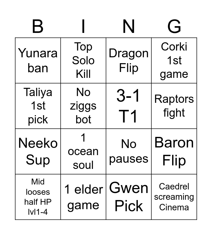 This bingo card has 16 words: 1 elder game, Baron Flip, Dragon Flip, Yunara ban, Neeko Sup, Top Solo Kill, No pauses, Gwen Pick, Taliya 1st pick, No ziggs bot, Mid looses half HP lvl1-4, Corki 1st game, 1 ocean soul, Raptors fight, 3-1 T1 and Caedrel screaming Cinema.