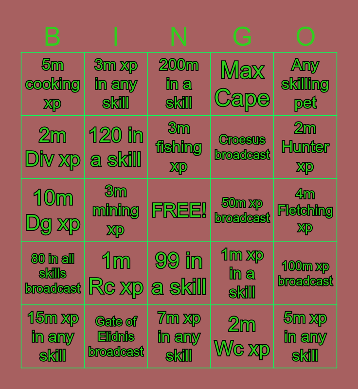 This bingo card has a free space and 24 words: 15m xp in any skill, 1m Rc xp, 3m fishing xp, 2m Wc xp, Any skilling pet, 5m cooking xp, 3m xp in any skill, 200m in a skill, 50m xp broadcast, 4m Fletching xp, 10m Dg xp, 120 in a skill, 1m xp in a skill, 100m xp broadcast, 2m Div xp, Gate of Elidnis broadcast, 7m xp in any skill, Max Cape, 2m Hunter xp, 80 in all skills broadcast, 3m mining xp, 99 in a skill, Croesus broadcast and 5m xp in any skill.