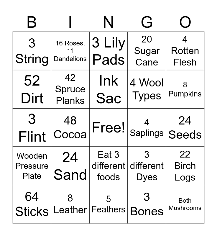 This bingo card has a free space and 24 words: 24 Sand, 8 Leather, Ink Sac, 64 Sticks, 4 Rotten Flesh, 3 String, 52 Dirt, 16 Roses, 11 Dandelions, 4 Saplings, Eat 3 different foods, 4 Wool Types, 3 Flint, 3 different Dyes, 22 Birch Logs, 42 Spruce Planks, 3 Bones, 24 Seeds, 3 Lily Pads, 8 Pumpkins, 48 Cocoa, Both Mushrooms, Wooden Pressure Plate, 20 Sugar Cane and 5 Feathers.