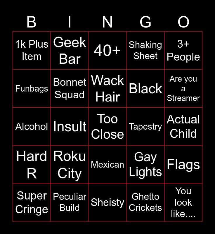 This bingo card has a free space and 24 words: Roku City, Peculiar Build, Wack Hair, Super Cringe, 3+ People, 1k Plus Item, Funbags, Geek Bar, Tapestry, Mexican, Black, Alcohol, Gay Lights, Flags, Bonnet Squad, Ghetto Crickets, Actual Child, 40+, Are you a Streamer, Insult, You look like...., Hard R, Shaking Sheet and Sheisty.