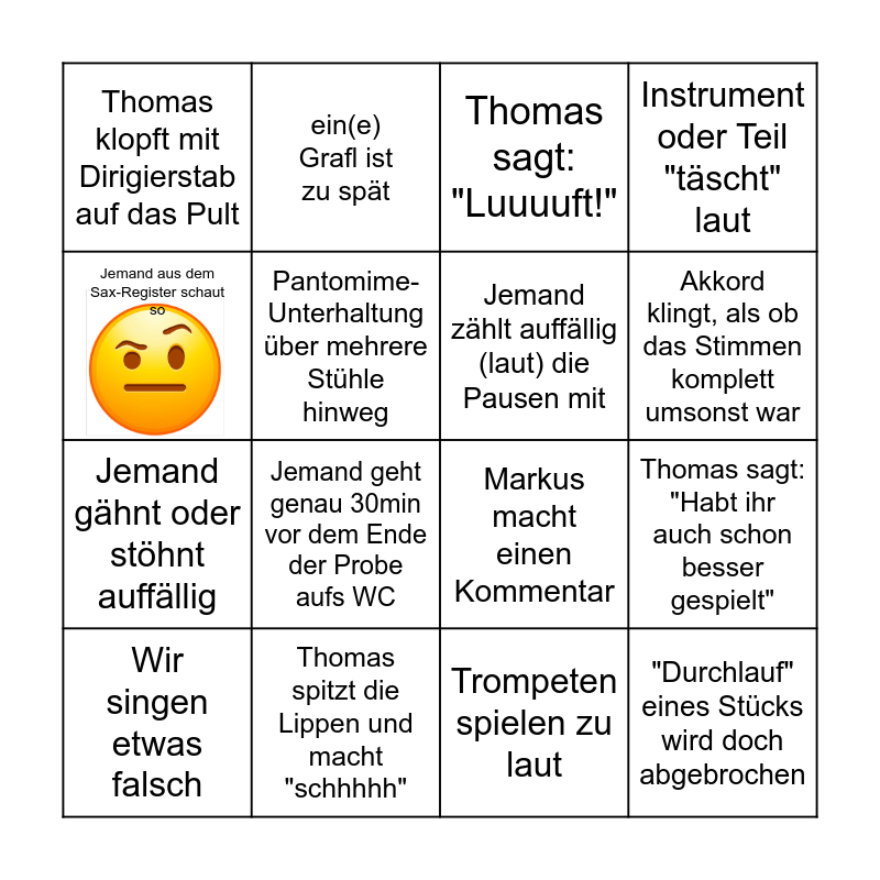 This bingo card has 1 images and 16 words: Thomas spitzt die Lippen und macht "schhhhh", Thomas sagt: "Habt ihr auch schon besser gespielt", Thomas sagt: "Luuuuft!", Thomas klopft mit Dirigierstab auf das Pult, Jemand gähnt oder stöhnt auffällig, ein(e) Grafl ist zu spät, Markus macht einen Kommentar, Trompeten spielen zu laut, Jemand aus dem Sax-Register schaut so, Pantomime-Unterhaltung über mehrere Stühle hinweg, Wir singen etwas falsch, Instrument oder Teil "täscht" laut, Jemand geht genau 30min vor dem Ende der Probe aufs WC, Akkord klingt, als ob das Stimmen komplett umsonst war, Jemand zählt auffällig (laut) die Pausen mit and "Durchlauf" eines Stücks wird doch abgebrochen.