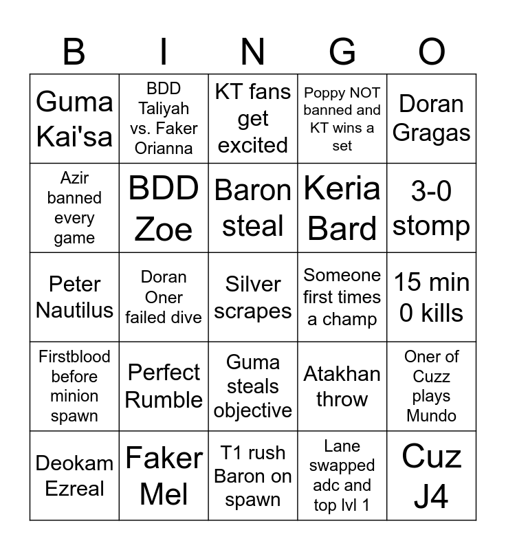 This bingo card has 25 words: Perfect Rumble, T1 rush Baron on spawn, Baron steal, Deokam Ezreal, Doran Gragas, Guma Kai'sa, Azir banned every game, BDD Taliyah vs. Faker Orianna, Someone first times a champ, Guma steals objective, Keria Bard, Peter Nautilus, Atakhan throw, Oner of Cuzz plays Mundo, BDD Zoe, Cuz J4, 15 min 0 kills, KT fans get excited, 3-0 stomp, Doran Oner failed dive, Silver scrapes, Faker Mel, Firstblood before minion spawn, Poppy NOT banned and KT wins a set and Lane swapped adc and top lvl 1.