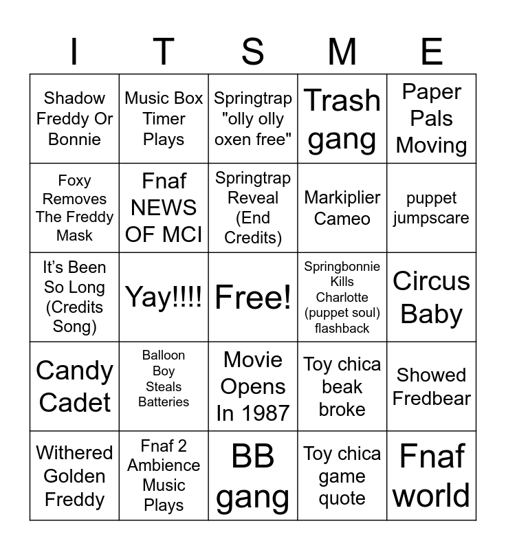 This bingo card has a free space and 24 words: Balloon Boy Steals Batteries, Fnaf 2 Ambience Music Plays, Springtrap Reveal (End Credits), Withered Golden Freddy, Paper Pals Moving, Shadow Freddy Or Bonnie, Foxy Removes The Freddy Mask, Music Box Timer Plays, Springbonnie Kills Charlotte (puppet soul) flashback, Movie Opens In 1987, Markiplier Cameo, It’s Been So Long (Credits Song), Toy chica beak broke, Showed Fredbear, Fnaf NEWS OF MCI, Toy chica game quote, Circus Baby, Springtrap "olly olly oxen free", puppet jumpscare, Yay!!!!, Fnaf world, Candy Cadet, Trash gang and BB gang.