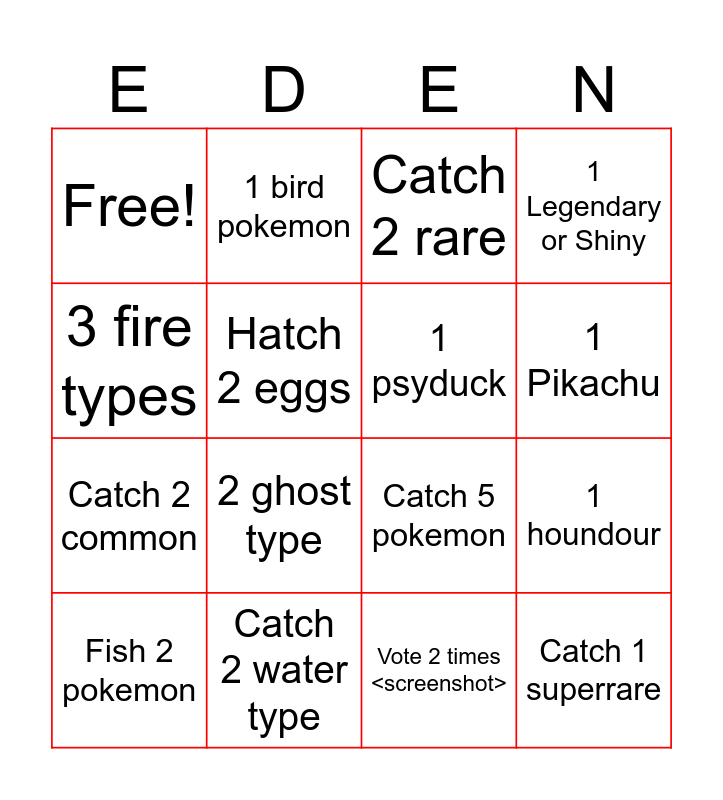 This bingo card has 16 words: Fish 2 pokemon, Catch 2 water type, Catch 2 rare, 1 Legendary or Shiny, 3 fire types, 1 bird pokemon, Catch 5 pokemon, 1 houndour, Free!, Hatch 2 eggs, Vote 2 times <screenshot>, 1 Pikachu, Catch 2 common, 2 ghost type, 1 psyduck and Catch 1 superrare.