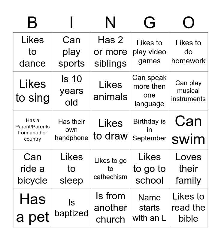 This bingo card has 25 words: Can ride a bicycle, Is baptized, Likes to draw, Name starts with an L, Likes to do homework, Likes to dance, Can play sports, Has 2 or more siblings, Birthday is in September, Loves their family, Likes to sing, Is 10 years old, Is from another church, Likes to go to school, Can play musical instruments, Has a pet, Has their own handphone, Likes animals, Can speak more then one language, Can swim, Has a Parent/Parents from another country, Likes to sleep, Likes to go to cathechism, Likes to play video games and Likes to read the bible.