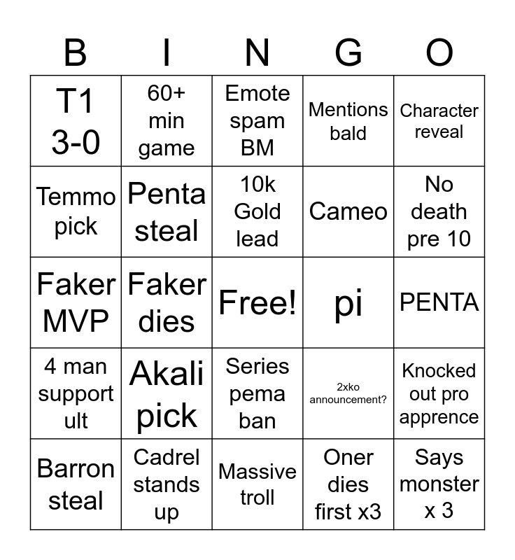 This bingo card has a free space and 24 words: Akali pick, Cadrel stands up, 10k Gold lead, Barron steal, Character reveal, T1 3-0, Temmo pick, 60+ min game, pi, Series pema ban, Cameo, Faker MVP, 2xko announcement?, Knocked out pro apprence, Penta steal, Oner dies first x3, PENTA, Emote spam BM, No death pre 10, Faker dies, Says monster x 3, 4 man support ult, Mentions bald and Massive troll.