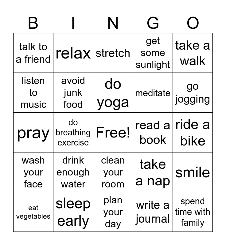 This bingo card has a free space and 24 words: drink enough water, sleep early, do yoga, eat vegetables, take a walk, talk to a friend, listen to music, relax, read a book, clean your room, meditate, pray, take a nap, smile, avoid junk food, write a journal, ride a bike, stretch, go jogging, do breathing exercise, spend time with family, wash your face, get some sunlight and plan your day.