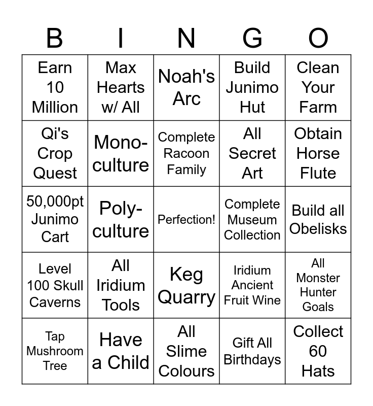 This bingo card has a free space and 24 words: All Iridium Tools, Have a Child, Complete Racoon Family, Tap Mushroom Tree, Clean Your Farm, Earn 10 Million, Qi's Crop Quest, Max Hearts w/ All, Complete Museum Collection, Keg Quarry, All Secret Art, 50,000pt Junimo Cart, Iridium Ancient Fruit Wine, All Monster Hunter Goals, Mono-culture, Gift All Birthdays, Build all Obelisks, Noah's Arc, Obtain Horse Flute, Poly-culture, Collect 60 Hats, Level 100 Skull Caverns, Build Junimo Hut and All Slime Colours.