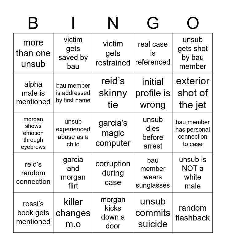 This bingo card has a free space and 24 words: garcia and morgan flirt, killer changes m.o, reid’s skinny tie, rossi’s book gets mentioned, unsub gets shot by bau member, more than one unsub, alpha male is mentioned, victim gets saved by bau, unsub dies before arrest, corruption during case, initial profile is wrong, morgan shows emotion through eyebrows, bau member wears sunglasses, unsub is NOT a white male, bau member is addressed by first name, unsub commits suicide, bau member has personal connection to case, victim gets restrained, exterior shot of the jet, unsub experienced abuse as a child, random flashback, reid’s random connection, real case is referenced and morgan kicks down a door.