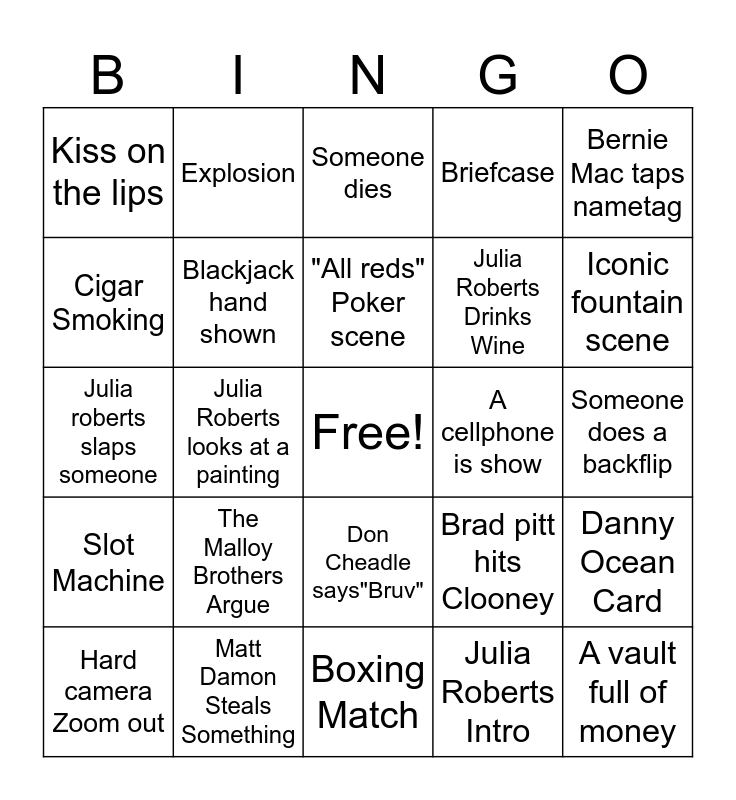 This bingo card has a free space and 34 words: Brad Pitt Eating a Snack, Julia Roberts Intro, Topher Grace Sighting, Elvis song, Slot Machine, Blackjack hand shown, Bernie Mac taps nametag, Hard camera Zoom out, Explosion, Fake heart attack, "All reds" Poker scene, Someone dies, A foreign language is spokem, Someone says “Bellagio”, A cellphone is show, Iconic fountain scene, Matt Damon Steals Something, Julia roberts slaps someone, The Malloy Brothers Argue, Brad pitt hits Clooney, Don Cheadle says"Bruv", A Walkie Talkie is used, Kiss on the lips, Someone does a backflip, Boxing Match, A vault full of money, Briefcase, White Van, Julia Roberts Drinks Wine, Cigar Smoking, Credits Roll, Julia Roberts looks at a painting, Danny Ocean Card and "Mr. Ocean" is said.