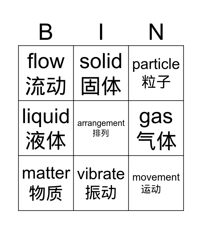 This bingo card has 9 words: matter 物质, particle 粒子, solid 固体, liquid 液体, flow 流动, gas 气体, arrangement 排列, movement 运动 and vibrate 振动.