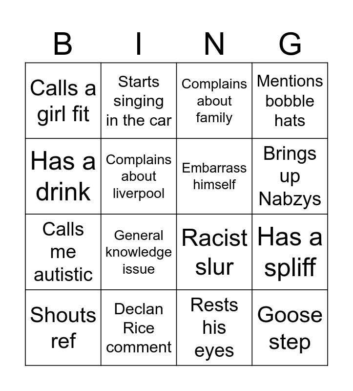 This bingo card has 16 words: Declan Rice comment, Has a spliff, Complains about family, Calls a girl fit, Calls me autistic, Starts singing in the car, Racist slur, Rests his eyes, Has a drink, Complains about liverpool, Shouts ref, Mentions bobble hats, General knowledge issue, Brings up Nabzys, Embarrass himself and Goose step.