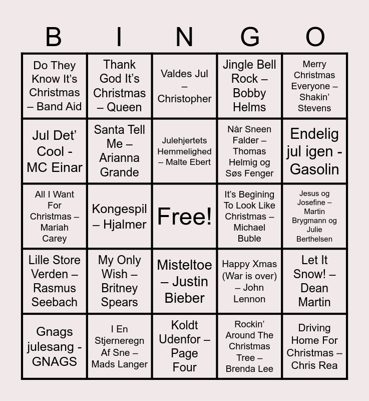 This bingo card has a free space and 41 words: Last Christmas - WHAM, All I Want For Christmas – Mariah Carey, Tinka - Burhan G og Frida Brygmann, Santa Tell Me – Arianna Grande, I En Stjerneregn Af Sne – Mads Langer, Misteltoe – Justin Bieber, Julehjertets Hemmelighed – Malte Ebert, Der’ Noget i December – Rasmus Seebach, Merry Christmas Everyone – Shakin’ Stevens, Lille Store Verden – Rasmus Seebach, Kongespil – Hjalmer, Jingle Bell Rock – Bobby Helms, Driving Home For Christmas – Chris Rea, Jesus og Josefine – Martin Brygmann og Julie Berthelsen, It’s Begining To Look Like Christmas – Michael Buble, My Only Wish – Britney Spears, It’s The Most Wonderful Time – Andy Williams, Do They Know It’s Christmas – Band Aid, Guld Jul – Gulddreng, Valdes Jul – Christopher, Let It Snow! – Dean Martin, Jul på Vesterbro – Anders Mattesen, Koldt Udenfor – Page Four, Når Sneen Falder – Thomas Helmig og Søs Fenger, Tidsrejsen – Caroline Castell, Snowman – Sia, Rockin’ Around The Christmas Tree – Brenda Lee, Den Himmelblå – Shu-Bi-Dua, Endelig jul igen - Gasolin, The Støvle Dance - De Nattergale, Jul i Angora – Drengene fra Angora, Thank God It’s Christmas – Queen, Gnags julesang - GNAGS, Søren Banjomus - Otto Brandenburg, Happy Xmas (War is over) – John Lennon, Jul Det’ Cool - MC Einar, Feliz Navidad – José Feliciano, Bjældeklang - John Mogensen, Wonderful Christmastime - Poul McCartney, Have yourself a merry Christmas - Sam Smith and Mary's BoyChild - Boney M.
