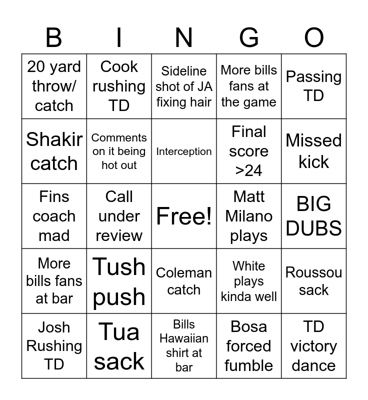 This bingo card has a free space and 24 words: Tush push, Tua sack, Interception, Josh Rushing TD, Passing TD, 20 yard throw/ catch, Shakir catch, Cook rushing TD, Matt Milano plays, Coleman catch, Final score >24, Fins coach mad, White plays kinda well, Roussou sack, Comments on it being hot out, Bosa forced fumble, BIG DUBS, Sideline shot of JA fixing hair, Missed kick, Call under review, TD victory dance, More bills fans at bar, More bills fans at the game and Bills Hawaiian shirt at bar.
