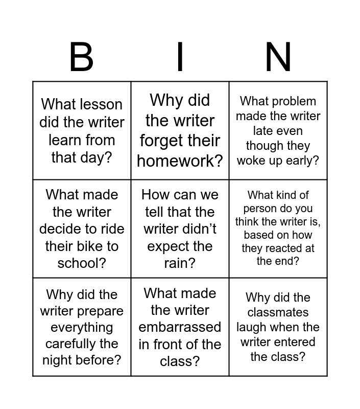 This bingo card has 9 words: Why did the writer prepare everything carefully the night before?, What problem made the writer late even though they woke up early?, Why did the writer forget their homework?, What made the writer decide to ride their bike to school?, What lesson did the writer learn from that day?, What kind of person do you think the writer is, based on how they reacted at the end?, How can we tell that the writer didn’t expect the rain?, Why did the classmates laugh when the writer entered the class? and What made the writer embarrassed in front of the class?.