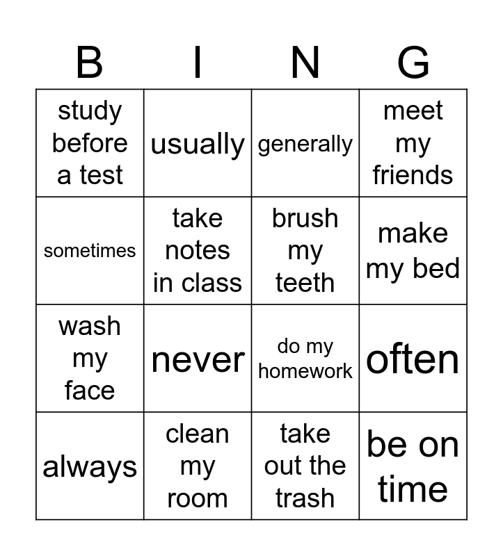 This bingo card has 17 words: Free!, always, usually, generally, often, sometimes, never, brush my teeth, make my bed, wash my face, clean my room, do my homework, meet my friends, study before a test, take notes in class, take out the trash and be on time.