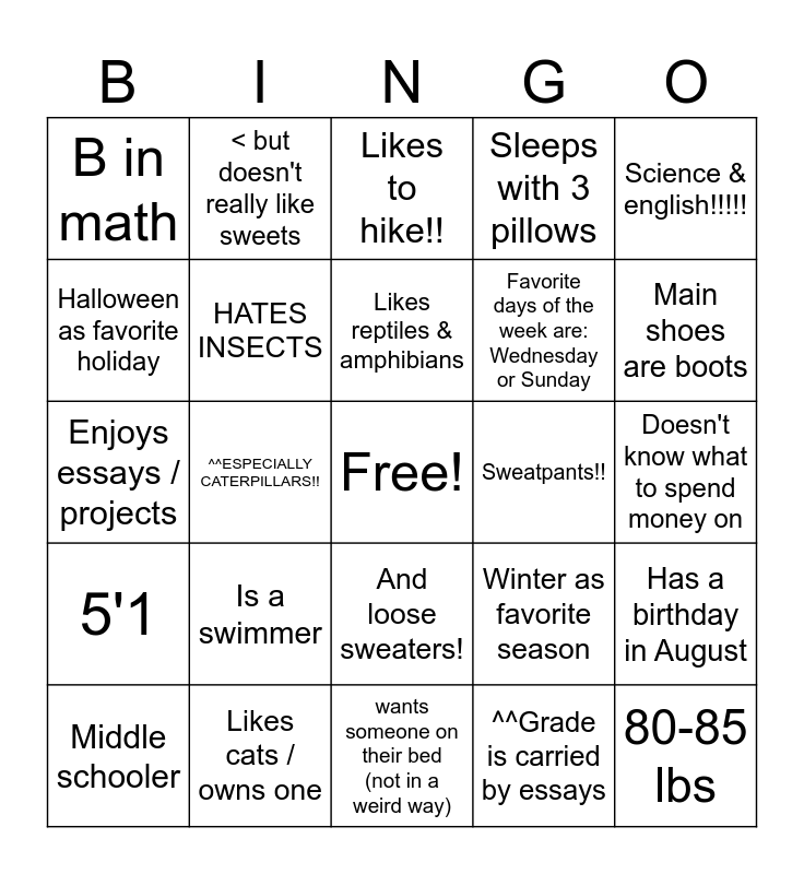 This bingo card has a free space and 24 words: Is a swimmer, Likes cats / owns one, Likes reptiles & amphibians, Middle schooler, Science & english!!!!!, B in math, Halloween as favorite holiday, < but doesn't really like sweets, Sweatpants!!, And loose sweaters!, Favorite days of the week are: Wednesday or Sunday, Enjoys essays / projects, Winter as favorite season, Has a birthday in August, HATES INSECTS, ^^Grade is carried by essays, Doesn't know what to spend money on, Likes to hike!!, Main shoes are boots, ^^ESPECIALLY CATERPILLARS!!, 80-85 lbs, 5'1, Sleeps with 3 pillows and wants someone on their bed (not in a weird way).