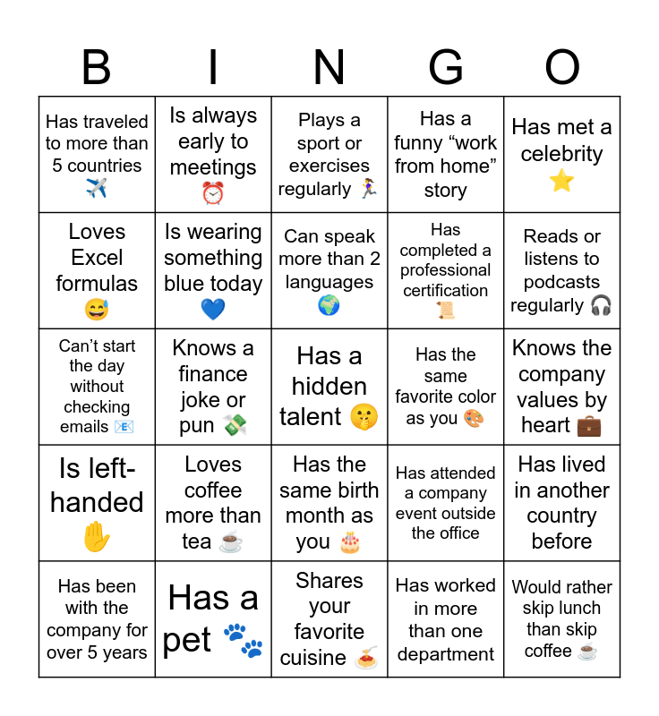 This bingo card has a free space and 24 words: Has been with the company for over 5 years, Loves coffee more than tea β, Can speak more than 2 languages π, Has worked in more than one department, Has met a celebrity β, Has traveled to more than 5 countries βοΈ, Is always early to meetings β°, Plays a sport or exercises regularly πββοΈ, Has the same favorite color as you π¨, Knows the company values by heart πΌ, Canβt start the day without checking emails π§, Is wearing something blue today π, Has attended a company event outside the office, Has lived in another country before, Loves Excel formulas π , Has a pet πΎ, Shares your favorite cuisine π, Has a funny βwork from homeβ story, Reads or listens to podcasts regularly π§, Is left-handed β, Knows a finance joke or pun πΈ, Has the same birth month as you π, Has completed a professional certification π and Would rather skip lunch than skip coffee β.